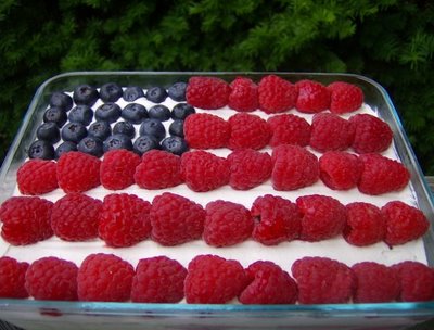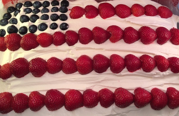 My mother always says that after the 4th, summer just flies by. Maybe that’s because the 4th of July is just so much fun. The food, fireworks, friends, family and finale of the fourth with a patriotic American flag cake. I always make the same cake, it’s tradition. It’s an easy one but yet pleasing to both the eye and the palate. Plus, I kid myself into believing that it’s healthy since it’s topped with fresh fruit! I also like it because you can make it and take it right in the pan, perfect to carry outdoors and add to the festivities.