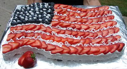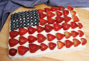 Just make any cake you like, we love dark chocolate with whipped cream frosting. After frosting your cake, place fresh washed blueberries in the left hand corner and line up fresh strawberry halves (or whole raspberries) across the rest of the cake in rows.