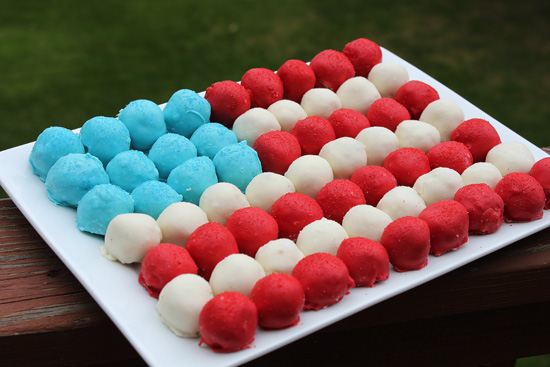 Cake balls have been quite the rage lately and do not require a special pan or grill like I first thought when seeing one the store. They are so moist and yummy. Even the kids can make these cake balls with the great step by step pictured instructions provided if you click the link to the left of the cake picture. And they’re so easy to pop in your mouth, no plates or even sticks are required for this American flag cake presentation. You can roll them in colored sprinkles for even more sparkle (and less stickiness).