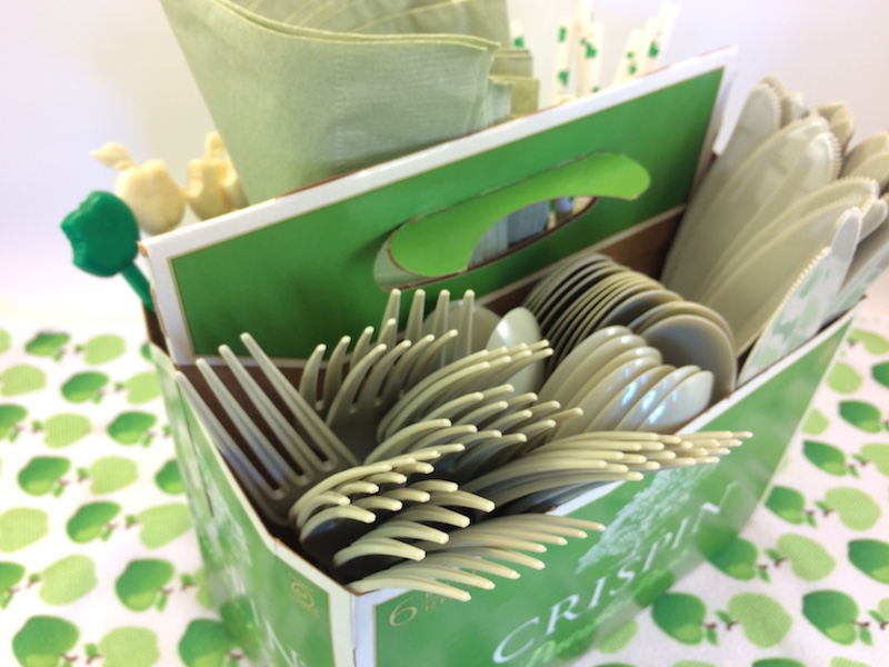 In fact, if you have another empty six-pack container it also works great as a utensil and napkin holder at the end of the buffet table. You can sort the silverware into separate slots and even offer napkins and straws all within easy reach and safe from a sudden gust of wind. No bulky empty container to pack back into the car when the party is over either, just head for the nearest recycle bin if tossing is desired.