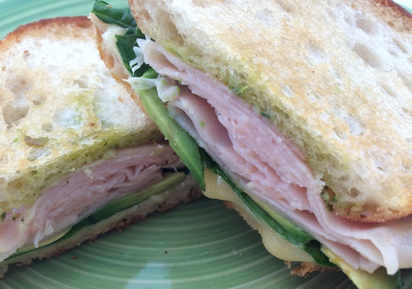 For instance this sandwich is more about the turkey and vegetables than the cheese, you could even leave it out. It’s sliced turkey, avocado, gouda cheese, arugula, tomato and red onion. Kind of a grilled turkey club, but the outside breads are have such a nice crunch that there’s no need for a center bread.