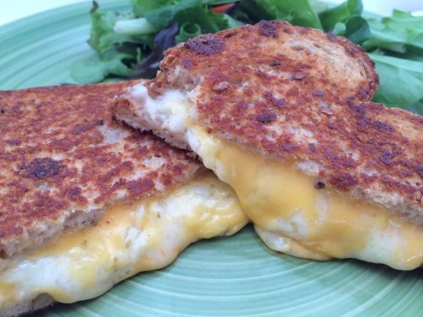 This one is on dense multigrain bread that makes it better for you and extra sturdy and tasty. We layered white cheddar cheese first and then added a layer of Velveeta for a gooey, tasty combination.