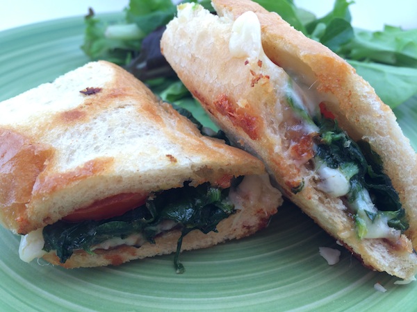 We used an old baguette for this one. That’s the great thing about grilled cheese sandwiches, they’re not dependent on the freshest bakery bread. We cut the rounded top off so that there was a flat grilling area. Then we filled it with Gouda cheese, spinach, tomatoes and grilled red peppers. Don’t waste the part you cut off, use it to make breadcrumbs or croutons.