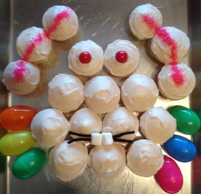 Starting with cupcakes to make a bunny cake is not only a fun way to make a bunny cake, but also makes clean up easier without plates and forks to wash.