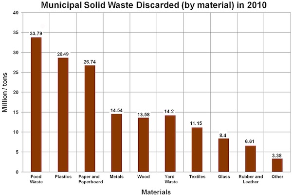 This chart from the U.S. Government Environmental Protection Agency’s Material Waste Report shows food waste accounting for the most total weight discarded (although it comes in 2nd to paper in terms of percentage of total material waste).