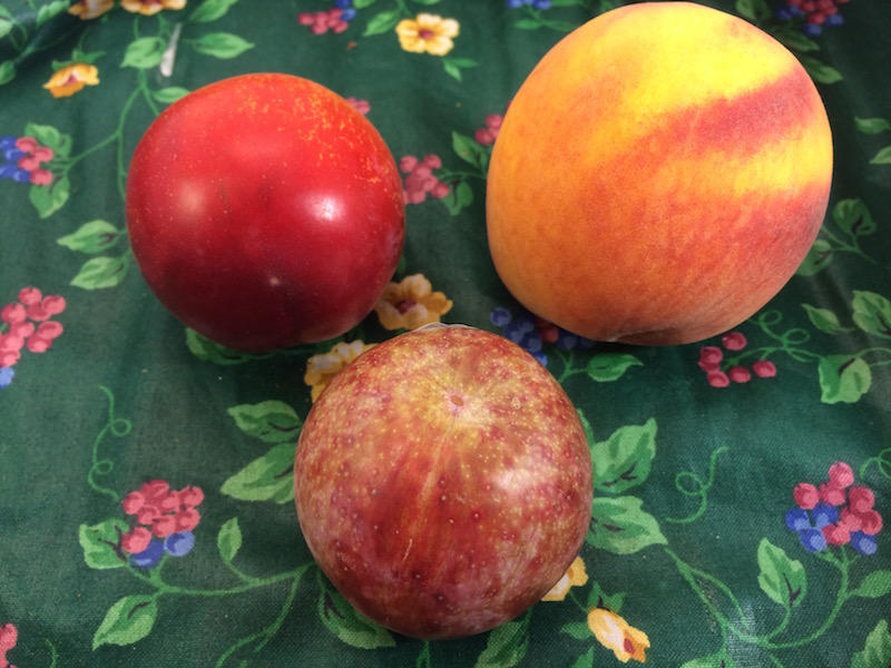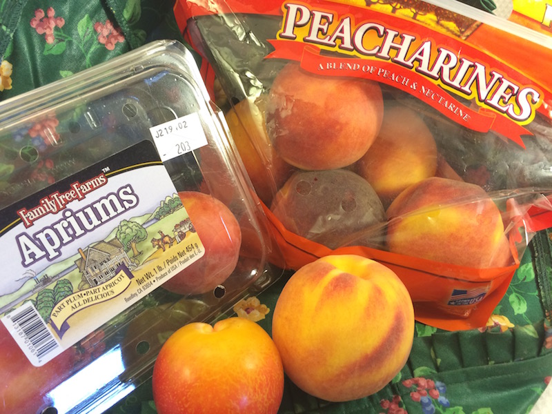 First of all, when searching through your local fruit stand or farmers market, you should note that whichever fruit is more dominant in the mixture of a particular hybrid fruit will have the beginning part of the name. With this in mind, you will notice that the pluot (front & center in the picture) is a plum/apricot mixture that more closely resembles a plum in both color, texture and taste whereas an aprium (on the left) looks closer to an apricot. But, looks can be deceiving. Furthermore, since genetically crossed hybrid fruit and vegetable names are granted after a patent application [1], you can often find multiple names for mixes of the same fruits.