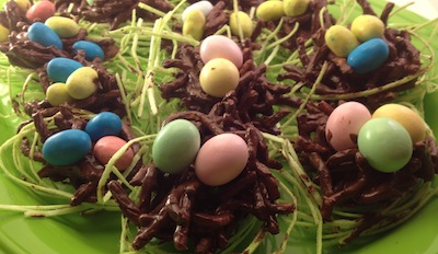 We made these by melting 8 ounces of semi-sweet chocolate (chocolate chips work fine) in the microwave stirring every 30 seconds until all melted and then adding about 2 cups of chow mein noodles. Use your hands to shape the mixture into round nests with a thumb indent in the top to fill with Cadbury mini eggs, M&M’s or jelly beans. Refrigerate to harden them up quickly. For this picture we placed them on some rounds of edible grass, which made them look pretty but the green grass actually tasted like paper while the chocolate nests were very difficult to stop eating.