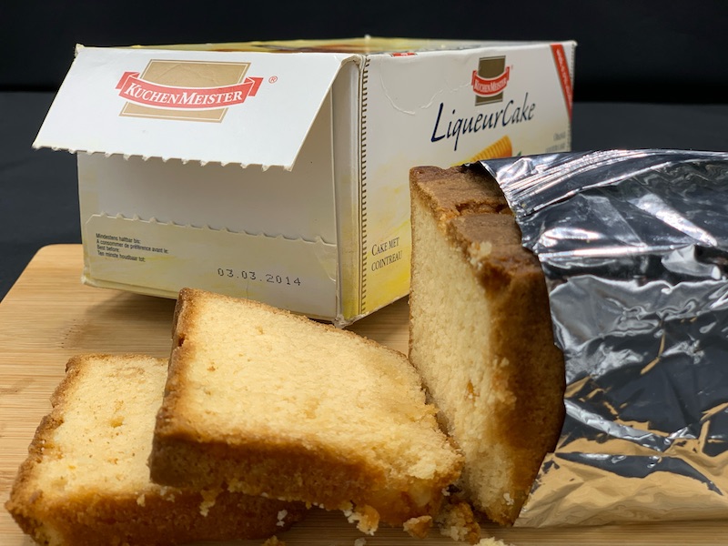 Next we checked the ingredient list and there were no quick to spoil items that would cause concern. Actually, there was one ingredient that was especially working on our side. Alcohol is a natural preservative that helps to inhibit the growth of bacteria. Freezing also does this, but the fact that this cake was also armed with internal alcohol gave extra security of a desired result.