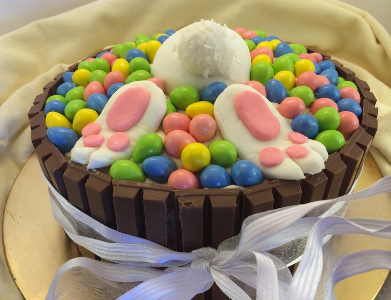 If you’re tired of the traditional bunny cake, give this more humorous one a try this Easter season. There are many different ways to make a bunny cake, we’ve given instructions for a few cute bunny cakes in the past. This one takes a little more imagination to create and to view, but it is probably easier to create than any of the rest since there is no cake cutting and thus no cake crumbs to contend with. It is also the sweetest cake to eat since the cake is completely covered in candy!