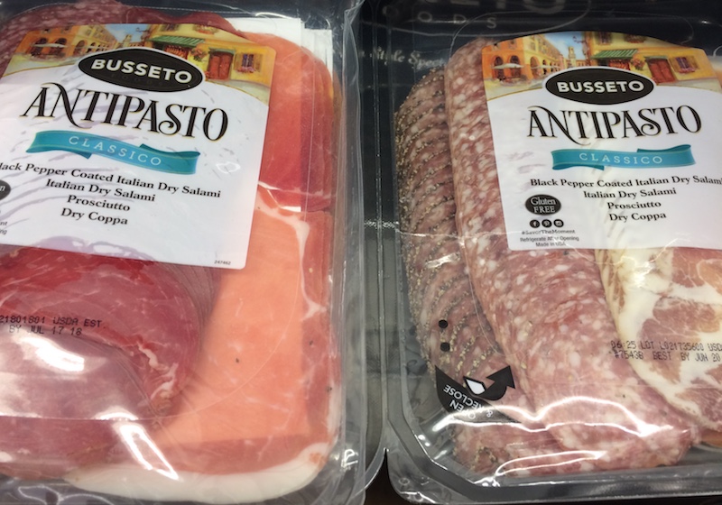 Charcuterie meats are sometimes purchased from a shelf and not a refrigerator. Salami and pepperoni packages are the perfect example, you can usually find them both in the refrigerator section and on the shelf in larger grocery stores. But, like any type of meat, one must be sure that they are fresh and safe to consume. Take the above picture for example, both best by dates are well before their time, yet notice the difference in the color of the meats. The one on the left is the accepted coloring for these particular charcuterie meats while the one on the right appears a grayish brown, making it questionable as to its age. This re-sealable package, although found in the refrigerated section right next to the other, may have either been sealed improperly, or previously opened and then re-sealed again, allowing air into the meats and the process of oxidation to begin or it may have had extended exposure to light. Again, proof that packaging and storage is often just as, if not more, important than a best by date when judging a product. The meats on the right will not look as appealing when displayed on a charcuterie board, but color alone is not an indication that the meat has spoiled. There are other factors to consider which we discuss on our deli meat page.
