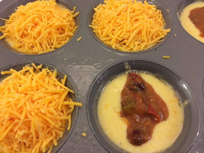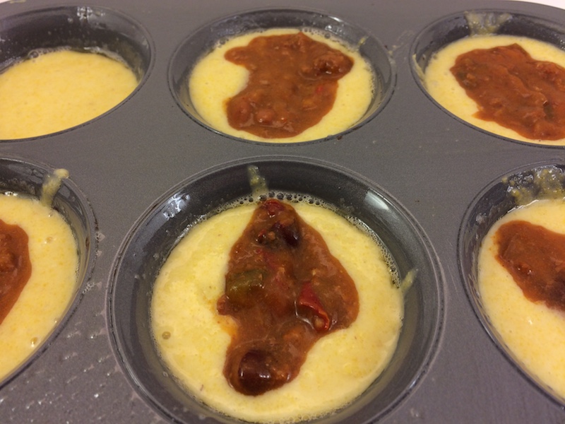 Then pour the mixture into a regular sized muffin pan – filling 12 holes instead of just the 6 that the package usually makes. - Place about 1 heaping tablespoon of chili into the center of each cornbread mixture.
