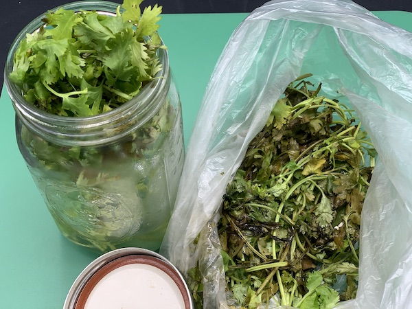 This picture illustrates a purchase of cilantro that was split into two bunches before storing in the refrigerator. Once bunch was placed into a plastic bag and then the refrigerator drawer while the other was placed into a canning jar with water as just explained.
