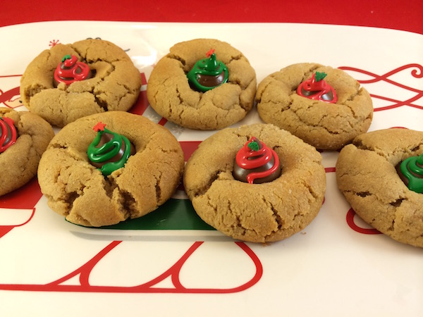 These peanut butter and chocolate cookies are a year round favorite for many. Make them special for Christmas with a quick spin of a decorative icing tube and then finish with a candy star sprinkle on top!
