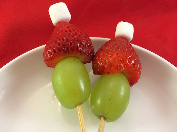 Make these cute Santa caps by arranging a grape (or you could use a honeydew melon ball), a slice of banana, a strawberry and then a mini marshmallow onto a small wooden skewer or toothpick. These might seem cute for little ones, but beware of your age group with sharp toothpicks.
