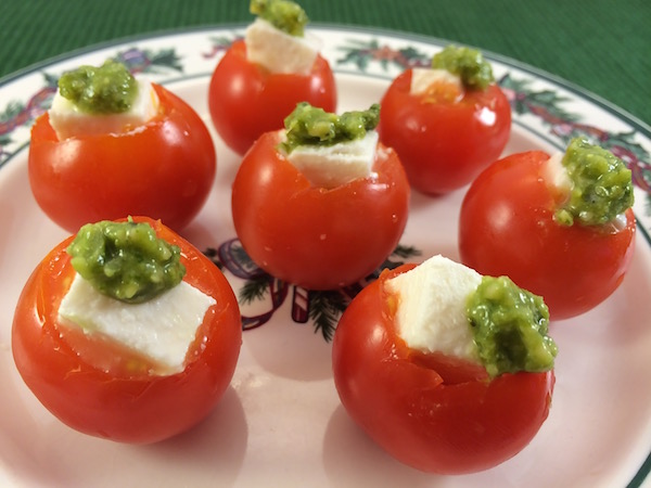 These bite sized appetizers are bursting with holiday spirit and flavor. Just gut cherry tomatoes and then stuff them with a cube of fresh mozzarella and a dab of pesto sauce. Alternately, you can arrange sliced tomatoes, basil & fresh mozzarella on a platter and drizzle with a little olive oil and black pepper. Bruschetta is also a nice option to make with tomatoes and basil.