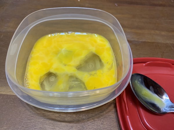 - Stir, but do not whip, the eggs so that the yolks and whites are mixed.
