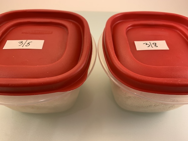 Wondering why we didn’t just add the later rice into the first container? If that had been done then both rices would expire according to the first date. Which is what transpired by using them both for fried rice, but we knew it would all be consumed on the night the fried rice was made. Just remember to remove any applied stickers and dispose of them properly before washing the containers.