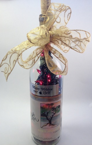 This is a bottle that I almost threw away when I found it in the attic but then I went to a craft fair last year and saw bottles like these just flying off the shelves. People were paying $30 for random bottles of wine decorated in this way. I also thought they were pretty, but the bottles had no personal meaning so I came home and gave this old bottle new life for Christmas. This idea keeps the bottle in the attic or basement most of the year, but then brings back the memories when it’s brought out to help light things up at Christmas. I used red lights in the clear bottle.