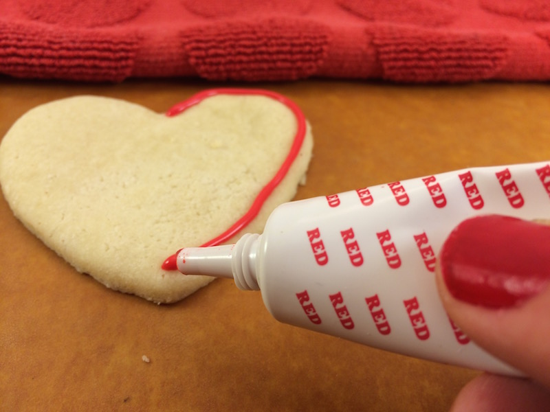 2) Grab a tube of cake decorating that you picked up half price from the Christmas sale, it’s still perfectly good and exactly the right color. Pipe a border around the edge of your heart. Do this step to all of your cookies first and by the time you’ve done all of them, the first ones should be dry enough for step #2.