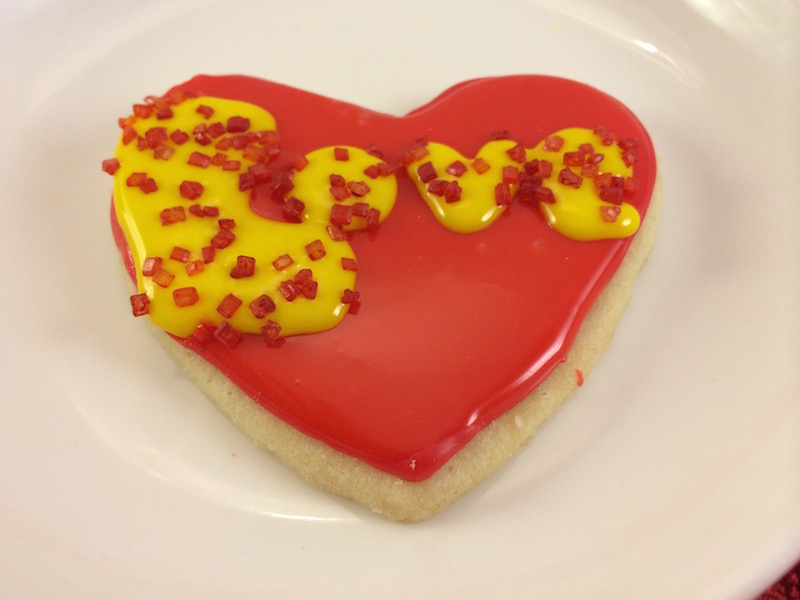 Showing your love with a heart is a time honored tradition. But don’t just slap some frosting on your cookie. Likewise, don’t allow it to run off the edges of your neatly cut-out cookie. Instead, give your royal icing a smooth, rounded edge all the way around the cookie.
