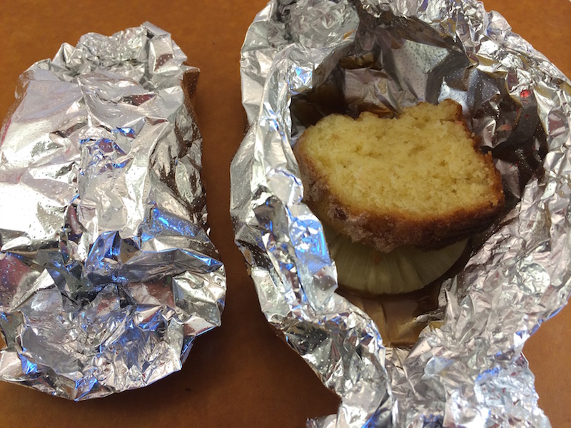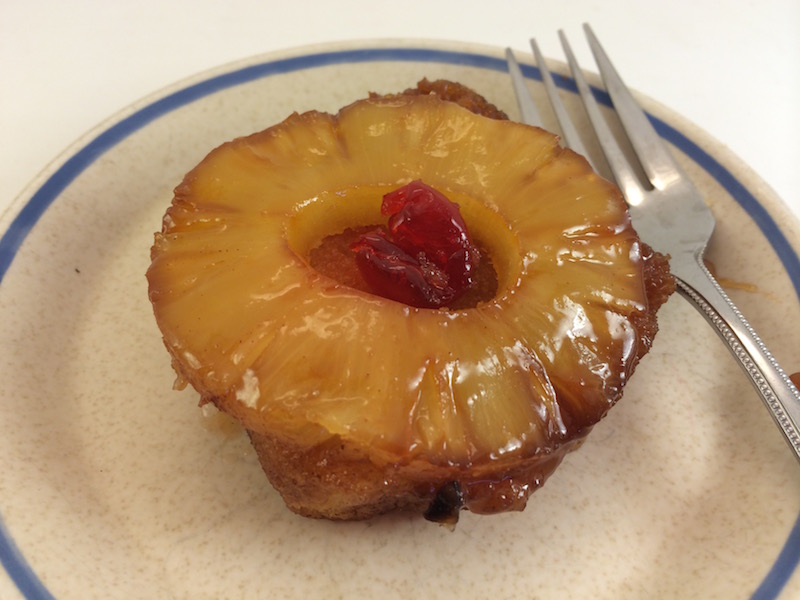 Take a square of tin foil and place a pat of butter (about 1 Tbs) in the center add about 2 Tbs of brown sugar on top and then a slice of pineapple. Put a maraschino cherry in the pineapple hole and then place a slice of pound cake on top (we used a slice of pudding cake left over from breakfast, you could also use a pre-made shortcake bun). Seal the tin foil into a tight packet. These are fun to place on the grill after you’ve taken your dinner off so they can bake while you’re eating and then be ready to enjoy. Cook the packets with the crimped side up for about 10-12 minutes on a hot grill.