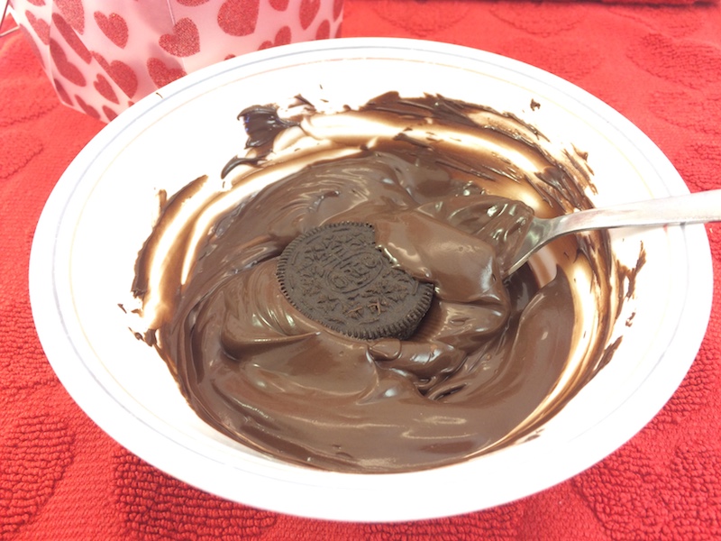 - Dip each cookie separately into the bowl of melted chocolate. A teaspoon works best to do task, and yes it can get messy. You can insert sticks from the side of the cookie into the filling of the Oreos before dipping, if desired, but there is a risk of breaking the cookie in the chocolate. It’s usually safest to insert the sticks after dipping the cookie, although it is messier.