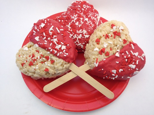 6) Spoon the chocolate onto half of the heart and then shake some Valentine sprinkles on top. You could instead drizzle the melted chocolate randomly over the treat for a different look, but it is not recommended to dip the entire heart in chocolate as it gets way too sweet for most people that way.
